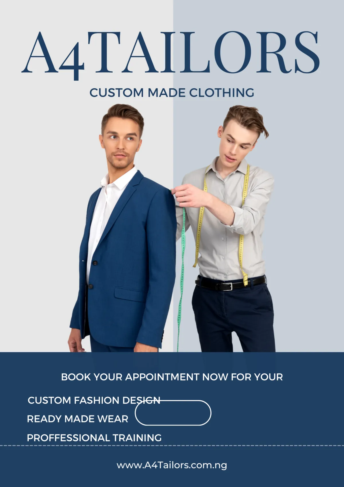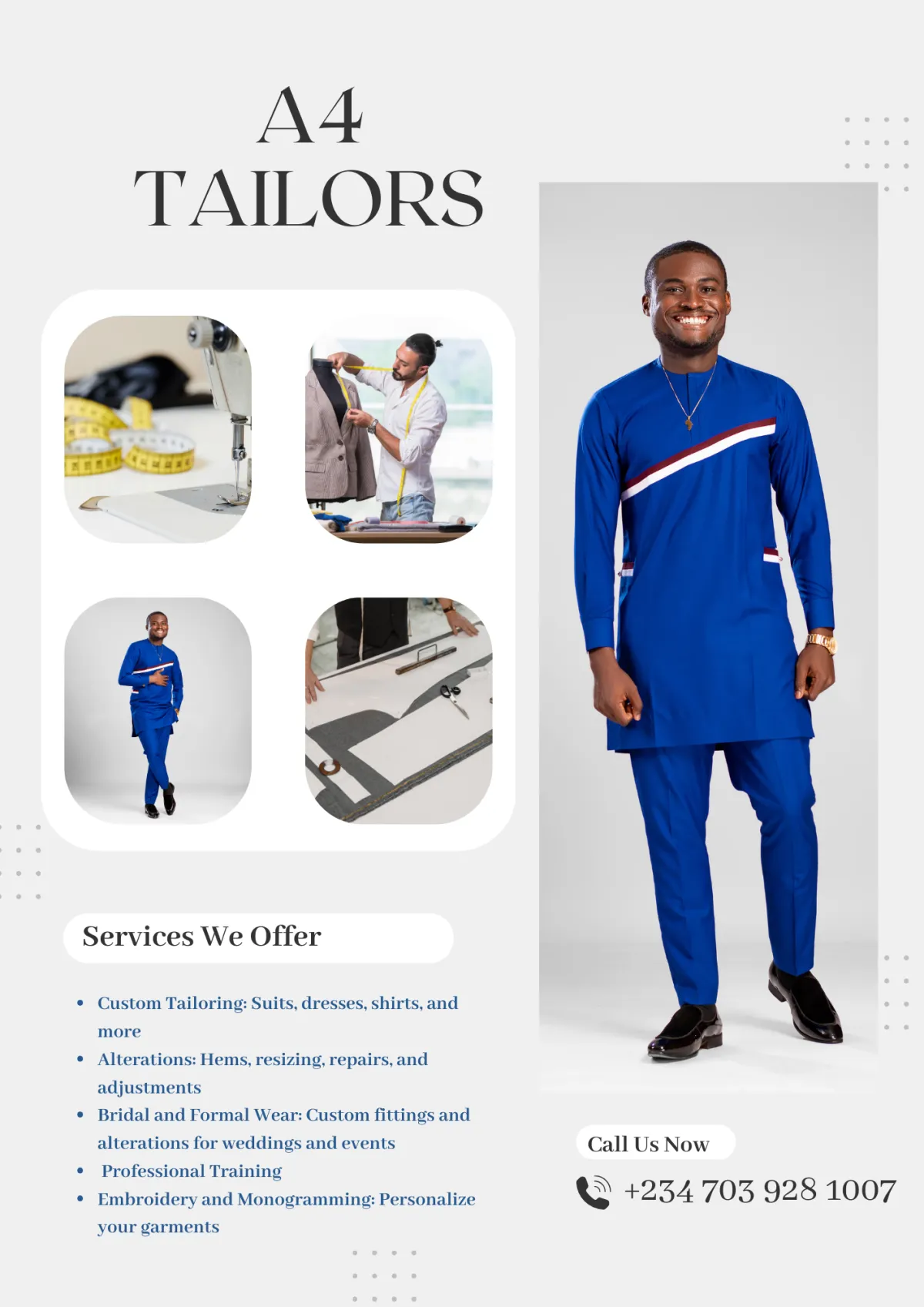 Choose A4Tailors for premium tailoring services that combine style, precision, and creativity. We deliver custom-made outfits tailored to your unique measurements and preferences, ensuring comfort and elegance for every occasion. Experience perfection with us!